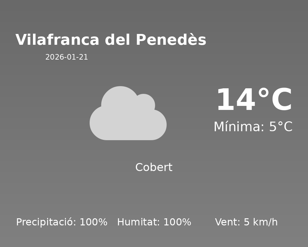 Avui a Vilafranca del Penedès ens espera un dia força humit amb una temperatura màxima de 14 °C i una temperatura mínima de 5 °C. Les condicions meteorològiques seran predominantment inestables, així que prepareu-vos per a un dia de climatologia complexa.