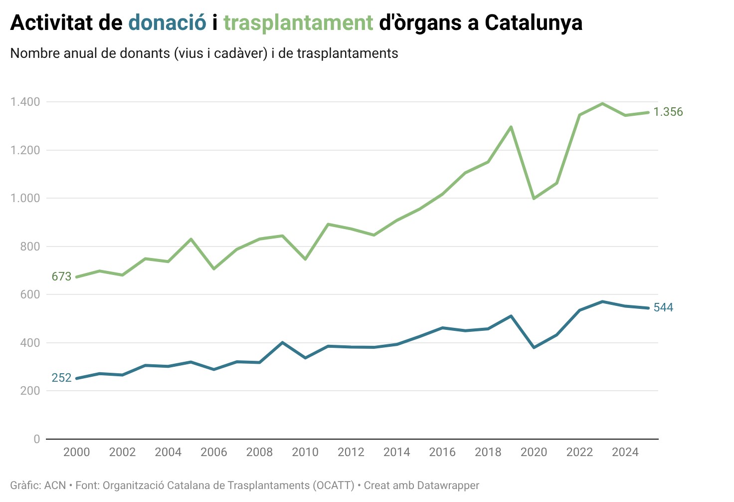 ACN Barcelona – Catalunya va fer 1.356 trasplantaments d’òrgans el 2025, un 0,8% més que el 2024 (1.345) i la segona millor xifra de la història, segons el balanç de l’Organització Catalana de Trasplantaments (OCATT). La millor dada es va donar el 2023 (1.393). La majoria dels trasplantaments del 2025 van ser renals, amb un total de 945 i un increment del 3,6% respecte del 2024; seguits dels hepàtics, amb 206 (-8%); els cardíacs, amb 68 (+4,6%); els pulmonars, amb 110 (+4,8%); i els pancreàtics, amb 27 (-30,8%). Pel que fa als donants, hi va haver 370 cadàvers (-2,9%) i 174 vius (+1,8%). L’OCATT ha alertat que les negatives familiars a la donació continuen pujant, fins a situar-se en el 27,6% del total de les entrevistes familiars fetes l’any passat.