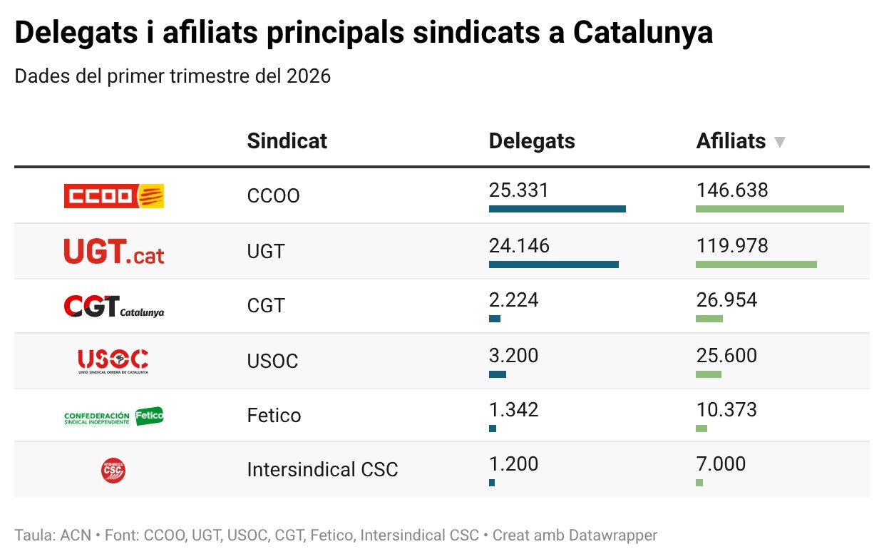 CCOO és la primera força sindical catalana amb 147.000 afiliats i 24.600 delegats mentre que la UGT és el segon sindicat més representatiu amb 120.000 afiliats i 23.200 representants sindicals.