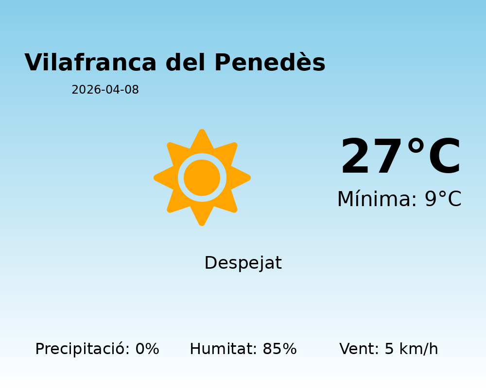 En resum, el temps d’avui a Vilafranca del Penedès es presenta com una oportunitat perfecta per gaudir del bon temps. Tant si teniu plans per a una sortida diürna com si preferiu activitats relaxants, les condicions meteorològiques seran idònies.