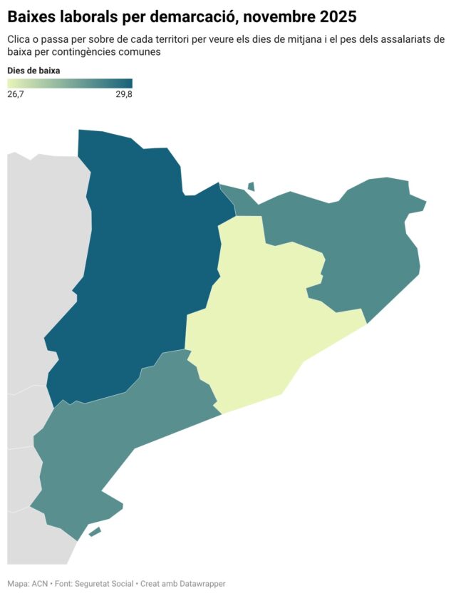 Per demarcacions, Barcelona se situa al llarg dels anys lleugerament per sota de la resta, amb 26,7 dies el novembre del 2025. Lleida, en canvi, tradicionalment està per sobre de la resta de territoris, amb 29,9 dies el mateix mes. Alhora, les comarques gironines es van situar en els 28,9 dies i les baixes a Tarragona i Ebre, en els 28,8 dies.
