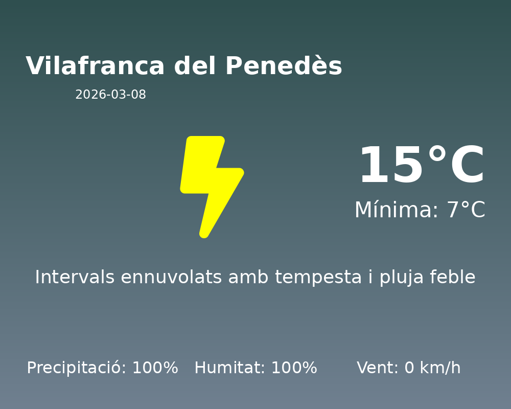 La jornada d’avui a Vilafranca del Penedès es presenta amb condicions meteorològiques que requereixen portar sempre un paraigua a mà, ja que la previsió anticipa una precipitació del 100% al llarg del dia. Aquesta situació ve acompanyada d’una humitat relativa també del 100%, cosa que pot fer que la sensació de xafogor sigui notable.
