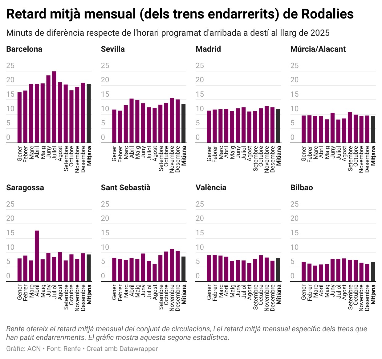 D’altra banda, tenint en compte només els serveis que circulen fora d’horari, el retard mitjà se situa al voltant dels 20 minuts en el cas de la xarxa catalana, amb el juliol destacat ratllant els 25 minuts. Es tracta, de nou, d’una xifra que destaca comparat amb la resta de xarxes de curta distància. Sevilla segueix Barcelona a molta distància, amb demores mitjanes de 13 minuts, mentre que Madrid se situa per sota dels 12 minuts, València en els vuit minuts i Bilbao per sota dels set, segons dades mensuals agregades per l’ACN.